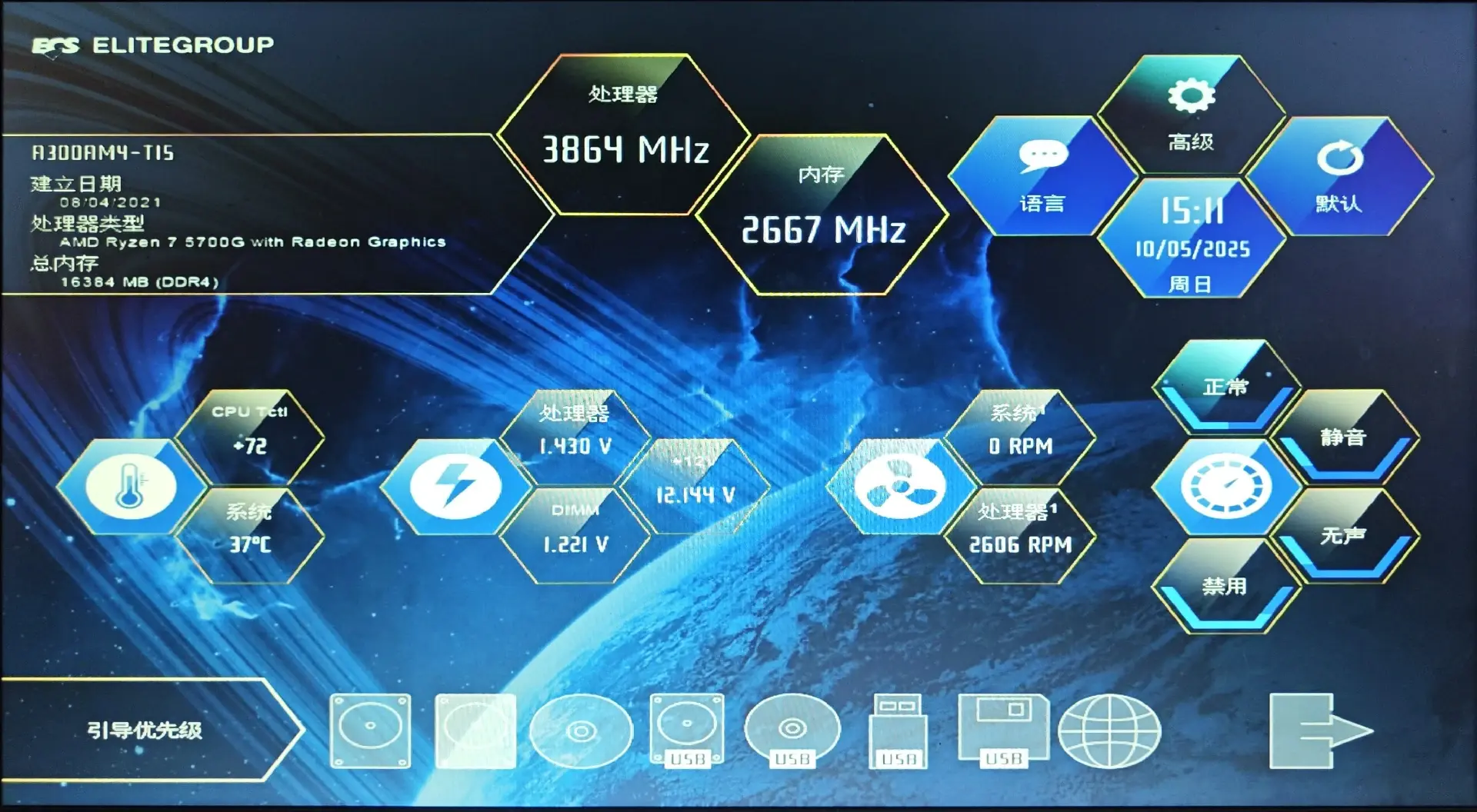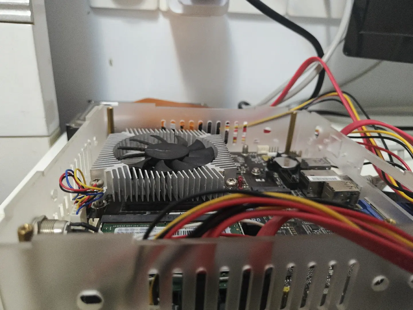 于是在国庆假前一周在筹划硬件购买的事,但是还没有打算买。直到国庆10月1号时闲鱼上看到个很便宜的板,精英a300带外壳和电源共200,讲价加上两条8g内存共270拿下;CPU就加价买了5700g,主频高,跑MC好,花去780,最后闲鱼整了个双盘位3D打印外壳,共1180元,还有小配件包括sata供电线。中间有个小插曲是外壳不小心寄学校了,赶紧喊同学寄回来,在等待外壳到的时间我就开始尝试点亮。
